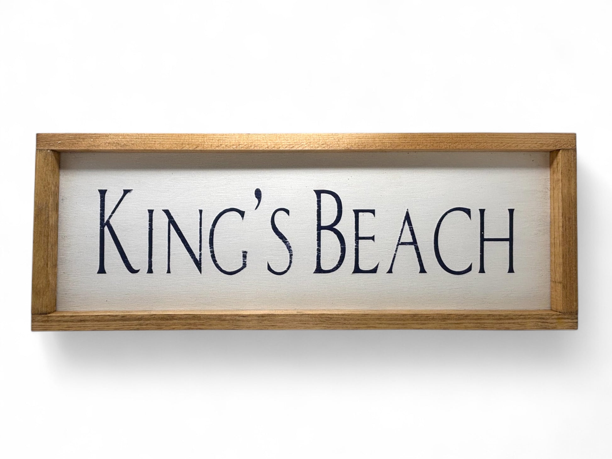 Celebrate King's Beach with a handcrafted Odd Cod wooden sign. Each piece begins with hand-painted lettering, then is carefully sanded and distressed to capture the timeworn character of the coast. We finish with a protective hand-applied wax and set the artwork in a hand-stained, routed wooden frame for warmth and durability,