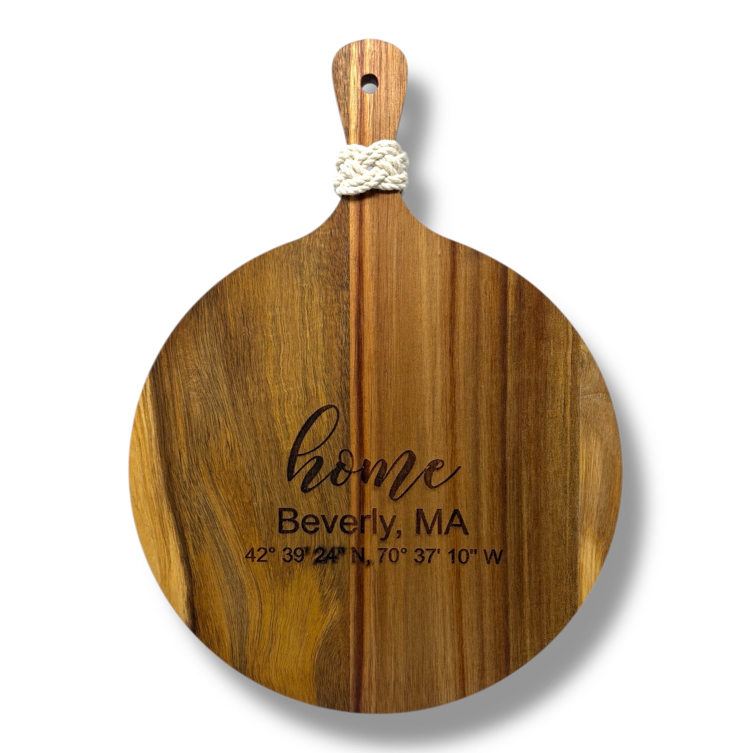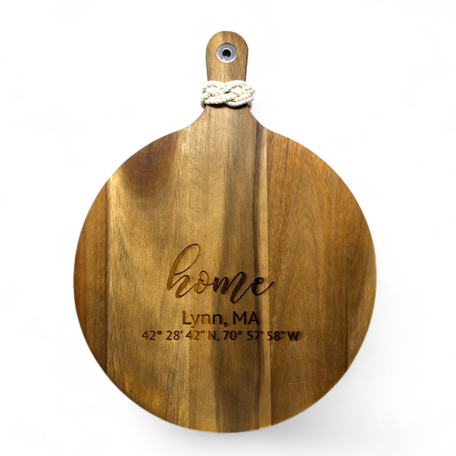 Across the surface, the word “Home” is engraved alongside the coordinates and name of your town, turning this board into a keepsake that’s as personal as it is practical. Whether used as a serving board for charcuterie, a prep board in the kitchen, or displayed as décor, it’s a timeless reminder of where you belong.